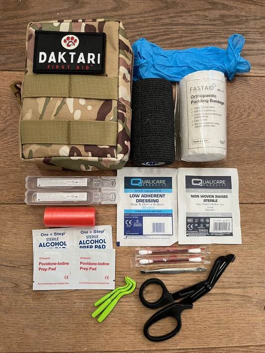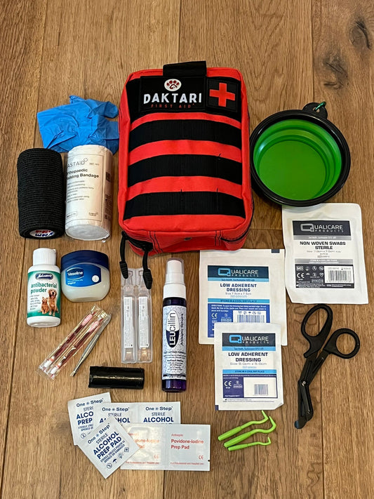A waterproof and durable bag filled with all the essential items to ensure you're well prepared to tend to your dog in the event of an accident.